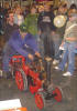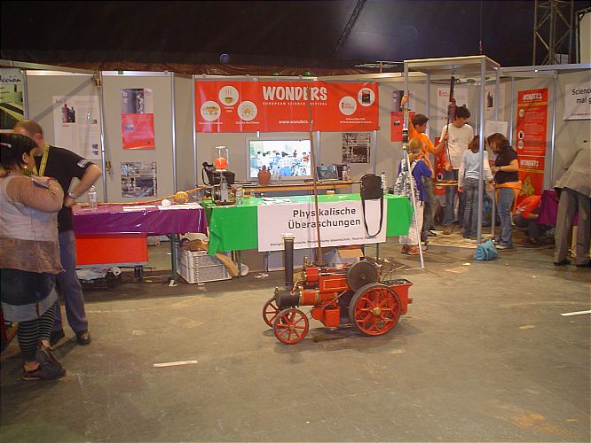 Tractor a vapor 'Pottoka' Como en otras ocasiones llevamos el tractor a vapor 'Pottoka' que construimos en el taller de Bolueta con los chavales durante los años 2001 a 2003. Es un modelo a escala 1:3.5 de un tractor a vapor inglés de la marca 'Aveling & Porter' de finales del siglo XIX. Observar la tecnología del vapor, el bajo número de revoluciones, lo potencia desarrollada, el sonido etc. es un espectáculo fascinante al lado de las demostraciones tecnológicas de última generación que se suelen presentar en este tipo de encuentros. Es divertido darse un viaje montado en el tractor por todos los stands de la feria. No quedó nadie sin sonreírse un poco cuando pasaba a su lado. Solemos trabajar con los chavales la potencia que desarrolla, a base de calcular el peso que puede arrastrar, la velocidad que alcanza, el peso que puede levantar con una grúa y el torno que incorpora. También observamos el comportamiento del vapor, húmedo, seco, la presión y la fuerza, la temperatura que alcanza, los valores de los humos de la combustión, el aprovechamiento de la energía del carbón, el bajísimo rendimiento en estos motores de vapor etc. A continuación incluimos algunas de las fotos que tomamos en la feria.